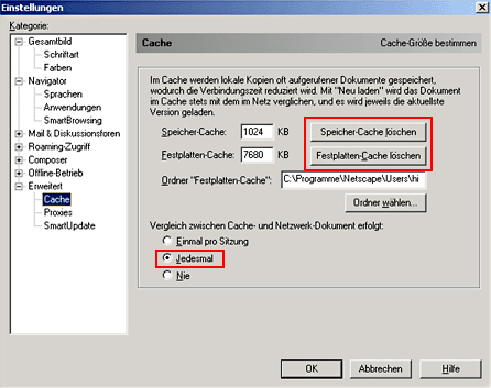 Wählen Sie im unteren Menü jedesmal damit Netscape die Seiten bei jedem Aufruf neu überprüft.